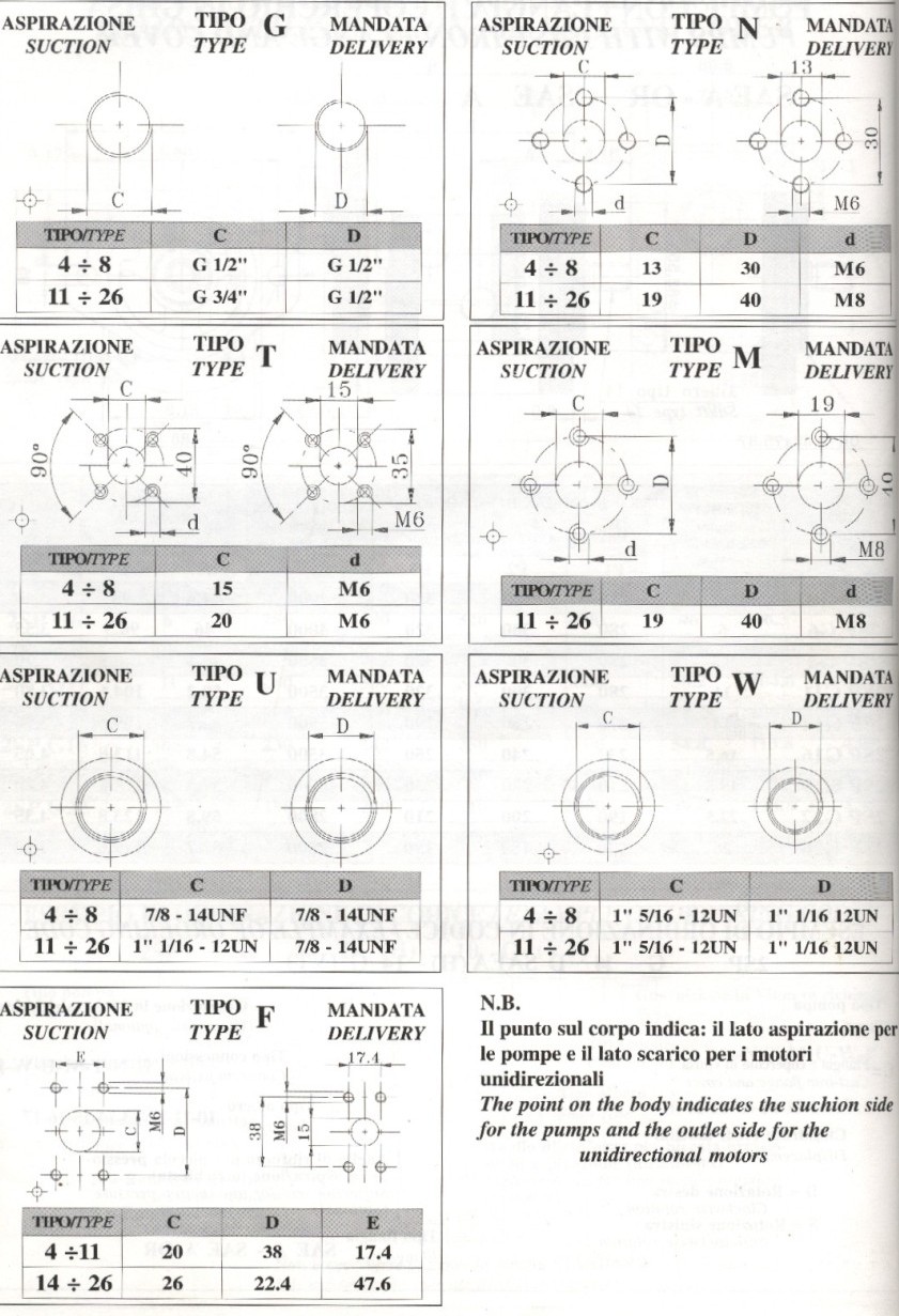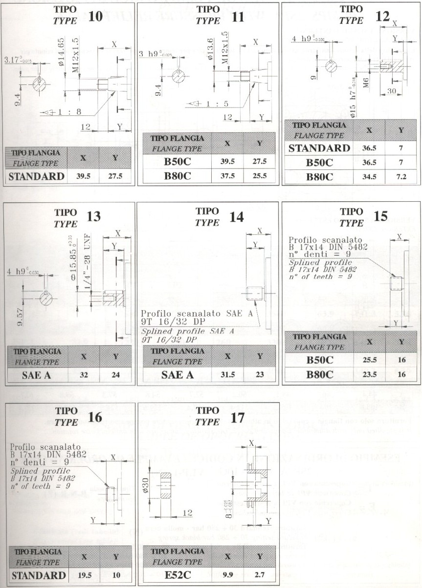 In der ersten Tabelle sehen Sie die Bezeichnung, die Fördermenge, den höchstzulässigen Druck und die max. Drehzahl. In der zweiten Tabelle sehen Sie ein Bestellbeispiel, die Informationen dafür bekommen Sie aus allen Tabellen. Aus der ersten Tabelle ersehen Sie den Pumpentyp. Aus der dritten die Art des Anschlusses, G, T, und N sind gebräuchliche Anschlüsse, Bosch Pumpen haben meist das T Anschlußbild, Standardpumpen haben G = BSP Gewinde, oder aber das N Anschlußbild für 3 Lochflansche. In der vierten Tabelle sind die verschiedenen Antriebe aufgelistet. Boschpumpen haben meistens einen Antrieb, mit 1:5 Konus, also Typ 11. Standardpumpen haben in der Regel einen Antrieb mit 1:8 Konus, also Typ 10. Typ 15 ist einen 9 Zahn Verzahnung und findet bei B 50 und B 80 Flanschen Verwendung. Typ 17 wird nur in Verbindung mit dem E 52 Flansch eingesetzt und findet auch in einigen Schleppern, wie z. B. im Steyr 8070 Verwendung. |